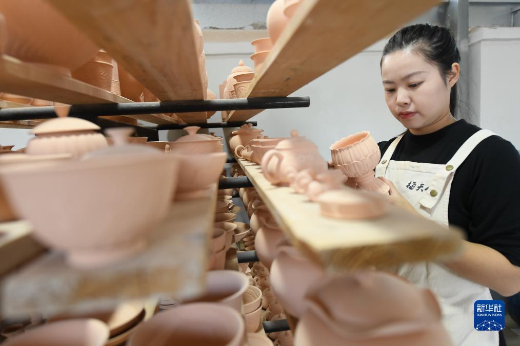10月31日,在“梅夫人”工作室,季資美查看等待上釉的蓮瓣紋香爐。