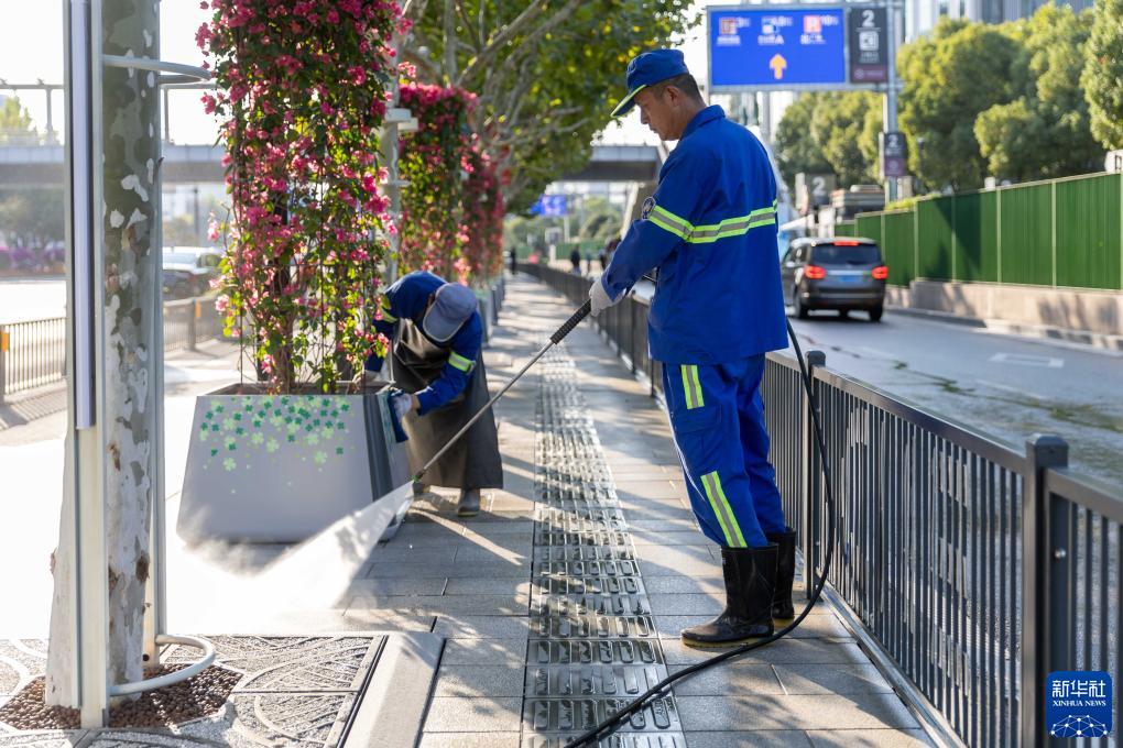 10月31日,環(huán)衛工人在場(chǎng)館周邊進(jìn)行清潔工作。