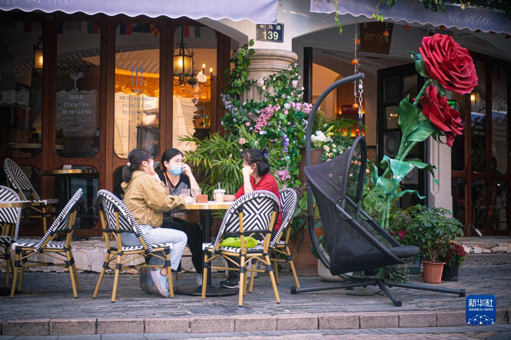 10月31日,游客在寧波老外灘步行街街頭休閑。