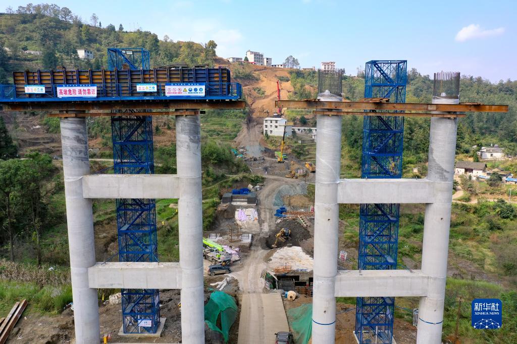 11月1日,正在進(jìn)行橋墩施工的老猴沖大橋(無(wú)人機照片)。