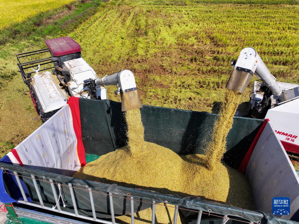 11月1日,在湖南省瀏陽(yáng)市龍伏鎮焦橋村的一處高標準農田,農戶(hù)將收獲的稻谷裝車(chē)(無(wú)人機照片)。