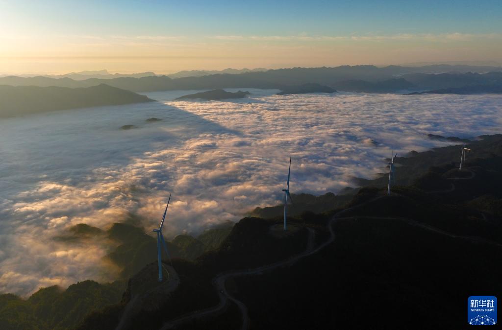 11月1日拍攝重慶市黔江區五福嶺風(fēng)電場(chǎng)晨景(無(wú)人機照片)。