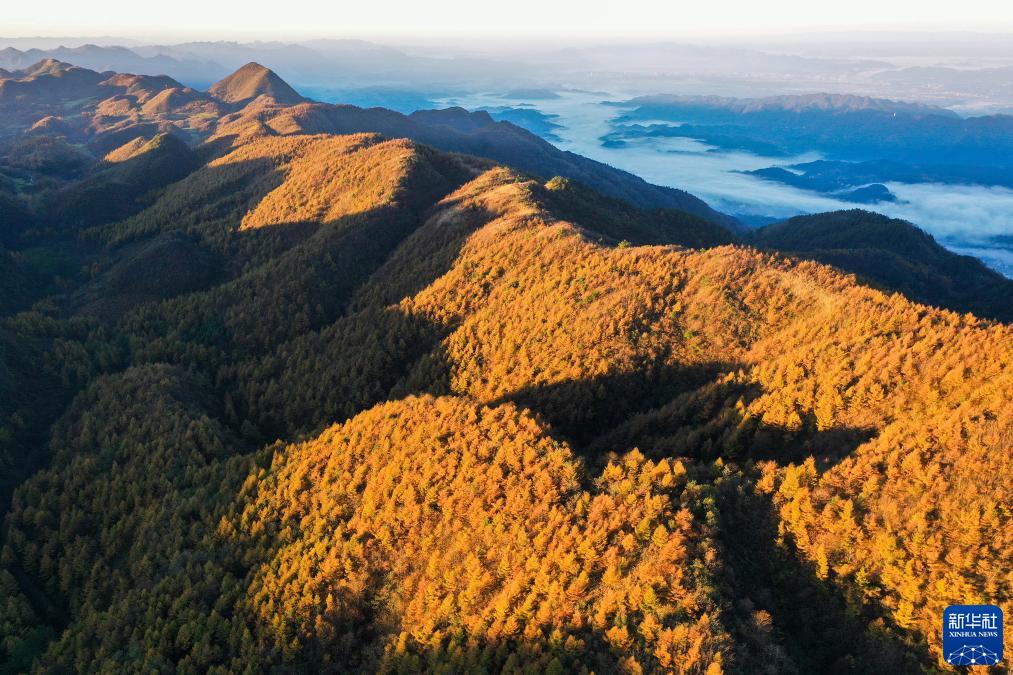 11月1日拍攝的湖南省湘西土家族苗族自治州龍山縣大安鄉萬(wàn)寶山林場(chǎng)秋色(無(wú)人機照片)。