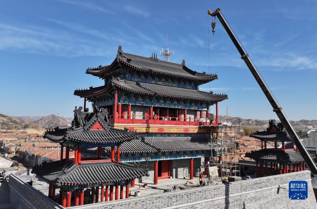11月1日,工人在河北省張家口市萬(wàn)全右衛城長(cháng)城國家文化公園文旅融合區項目建設工地施工(無(wú)人機照片)。