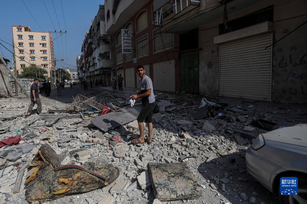 11月2日,人們走過(guò)遭以軍空襲后的加沙城房屋廢墟。