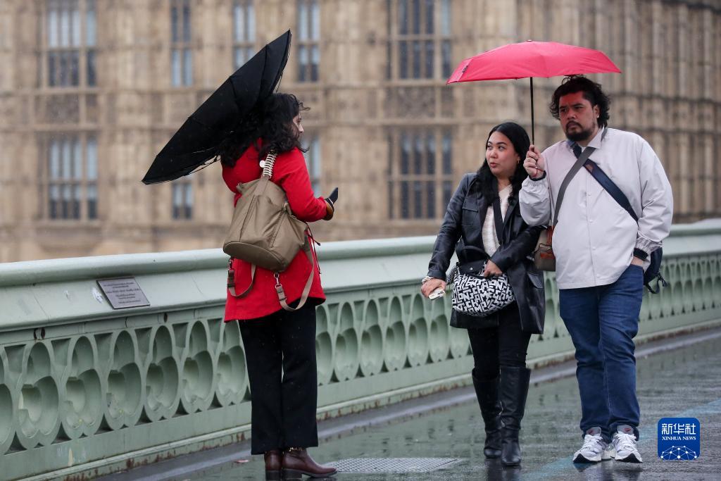 11月2日,在英國倫敦,人們打著(zhù)傘走在威斯敏斯特橋上。