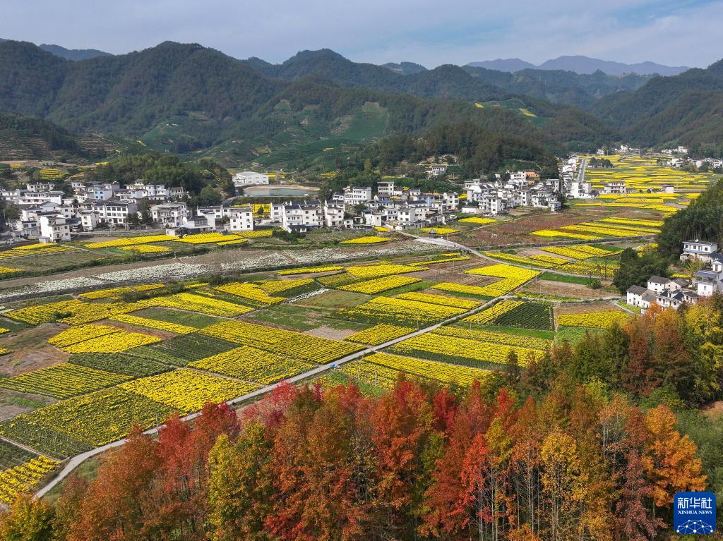 11月3日在安徽省黃山市歙縣溪頭鎮桃源村拍攝的菊花田(無(wú)人機照片)。