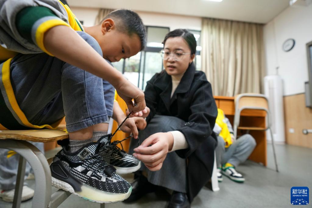 10月30日,在重慶市特殊教育中心的教室內,一名老師指導二年級視力障礙學(xué)生練習系鞋帶。