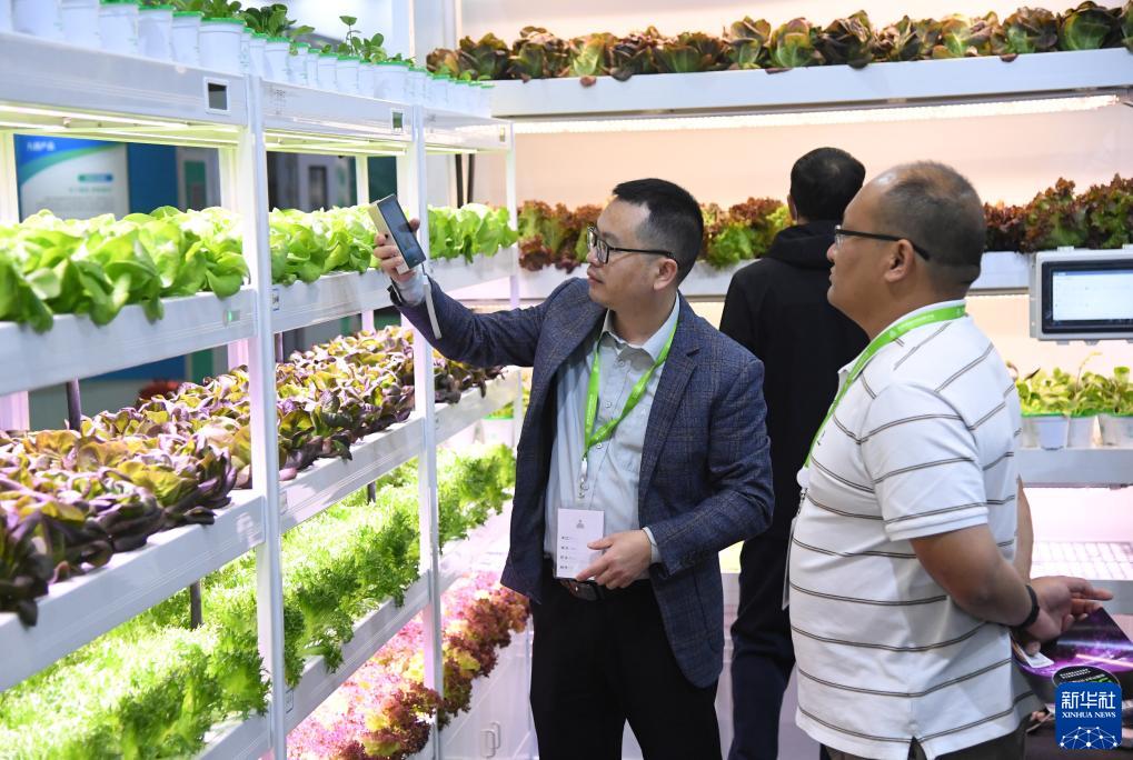 11月2日,工作人員(左)在世界農業(yè)科技博覽會(huì )現場(chǎng)介紹智慧植物工廠(chǎng)。