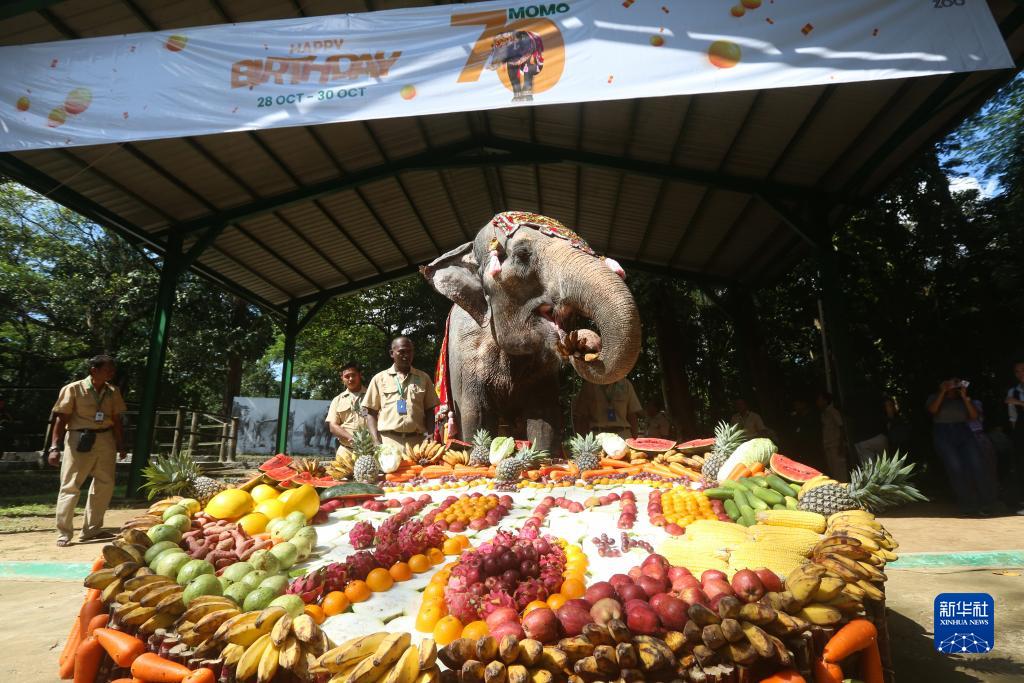 10月29日,雌性大象莫莫在緬甸仰光動(dòng)物園享用由水果和蔬菜制成的蛋糕。