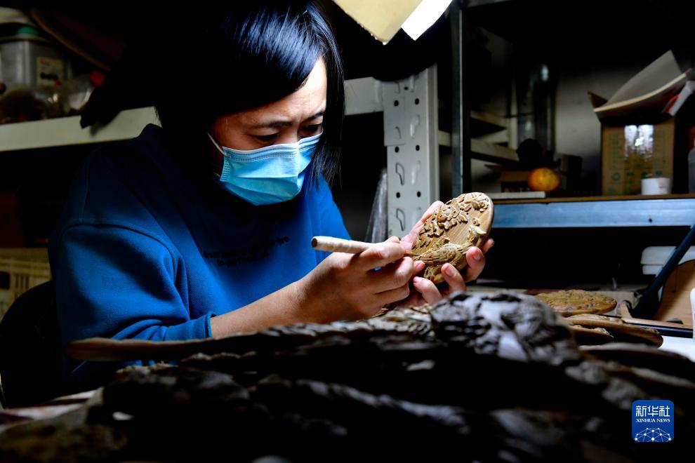 11月3日,在嘉祥縣一家木雕生產(chǎn)企業(yè),工作人員在雕刻木梳。