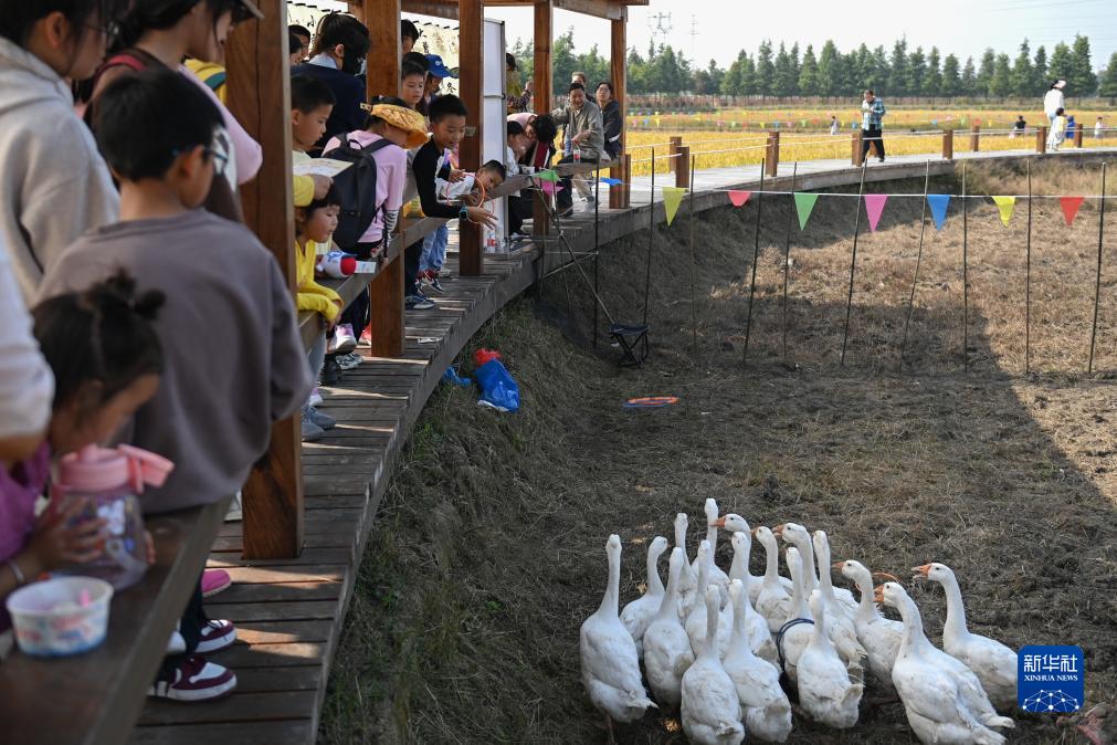 11月4日,游客在南潯區雙林鎮萬(wàn)畝稻蝦綜合種養示范區的稻田游園會(huì )體驗套圈游戲。