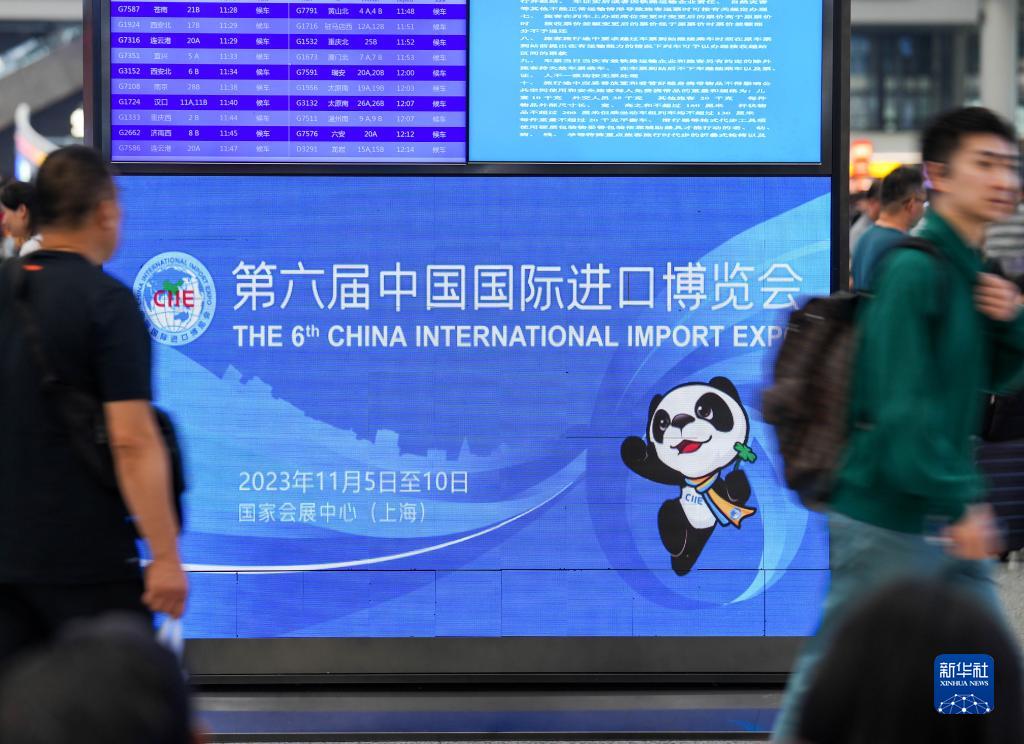 11月3日,旅客在上海虹橋火車(chē)站內路過(guò)第六屆進(jìn)博會(huì )海報。