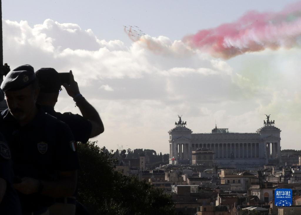 11月4日,意大利“三色箭”飛行表演隊噴出象征國旗三色的煙霧飛過(guò)羅馬上空,慶祝國家團結日。