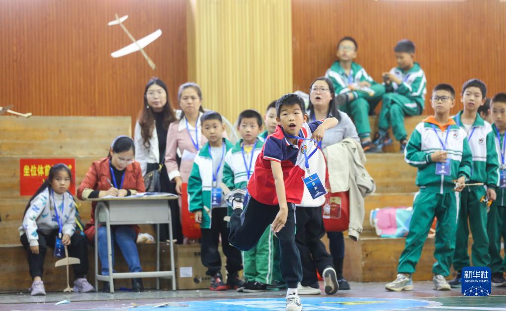 11月5日,在首屆青少年科技體育節上,參賽學(xué)生手擲輕飛機。