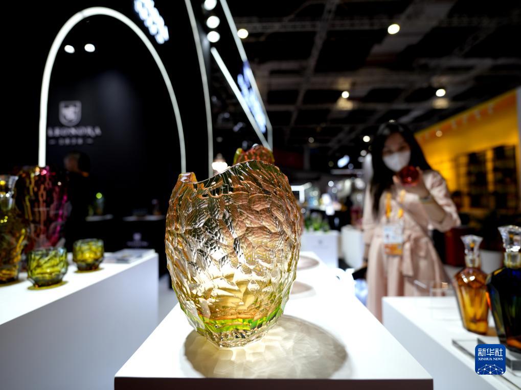 11月5日,觀(guān)眾在第六屆進(jìn)博會(huì )消費品展區捷克歐若拉水晶展臺參觀(guān)首次展出的水晶新品。