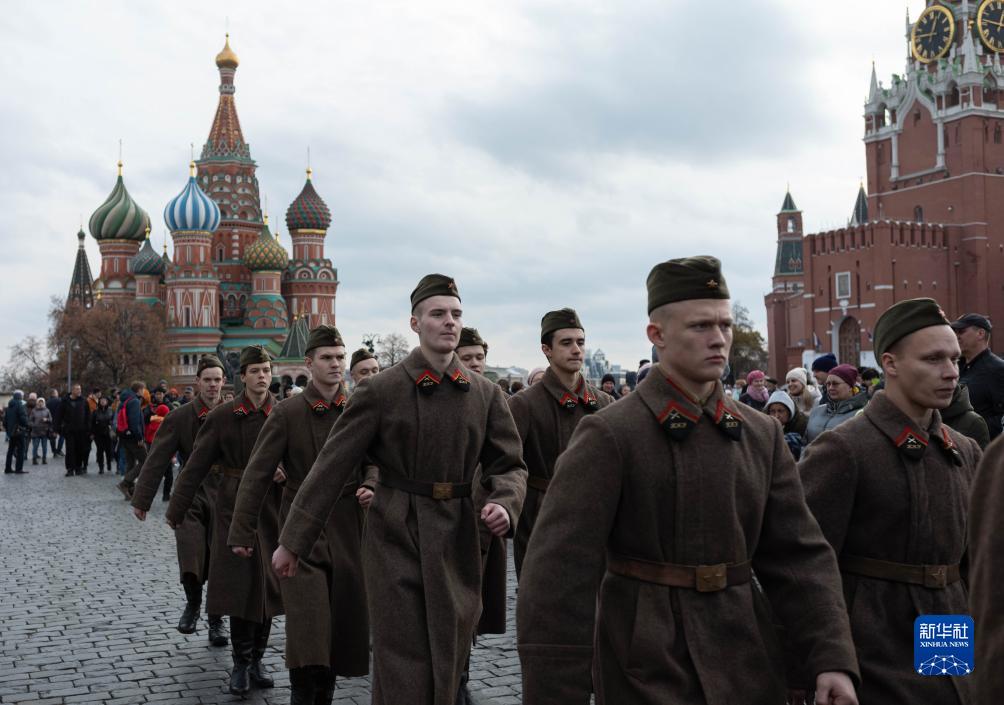 11月5日,在俄羅斯首都莫斯科,參加紀念活動(dòng)的演員走過(guò)紅場(chǎng)。