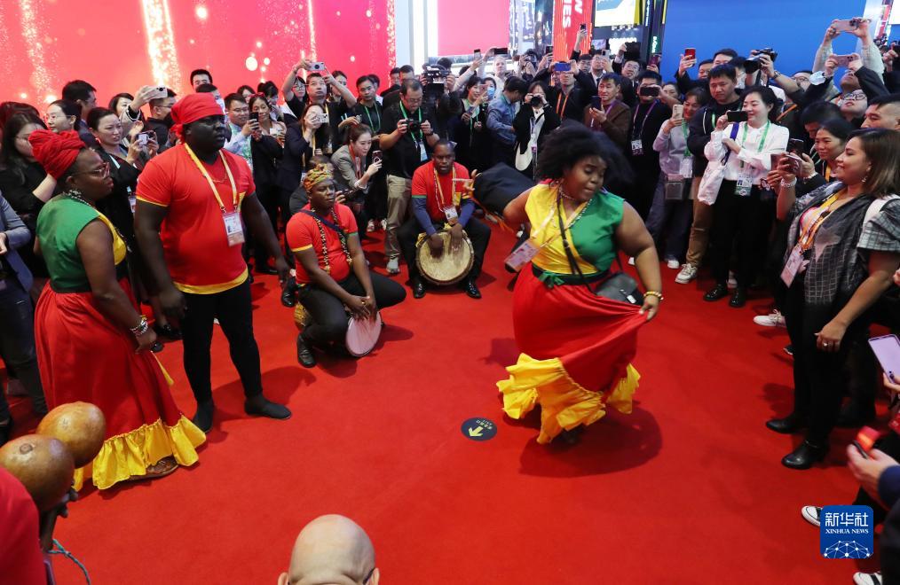 11月6日,來(lái)自第六屆進(jìn)博會(huì )國家展洪都拉斯展臺的演職人員在現場(chǎng)進(jìn)行文藝表演。