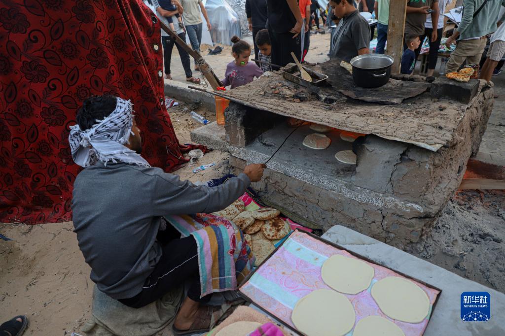 11月6日,因缺乏燃料,在加沙地帶南部城市汗尤尼斯的一處臨時(shí)難民營(yíng),人們用粘土砌成的爐子烤制面包。