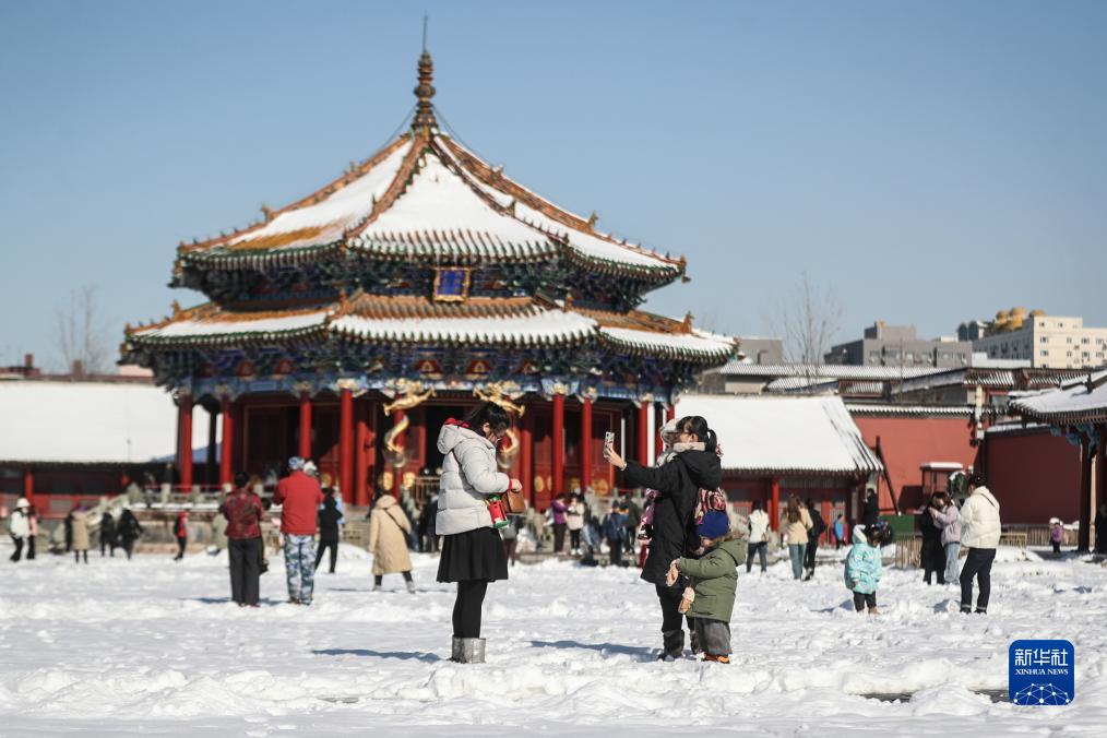 11月7日,游客在雪后的沈陽(yáng)故宮游覽拍照。