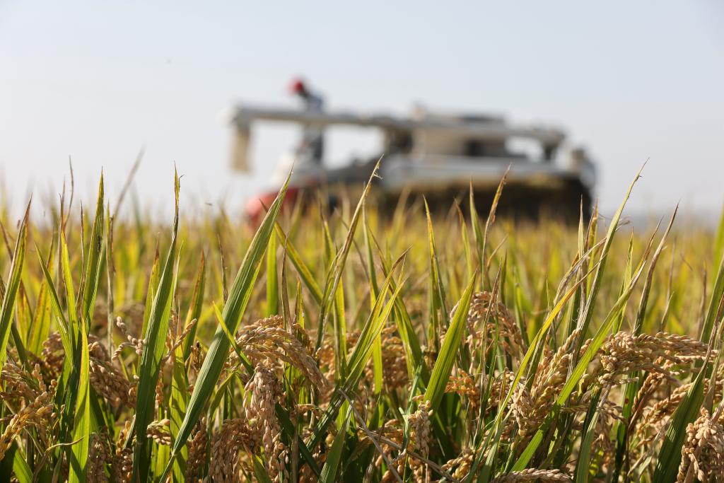 11月7日,在江蘇省淮安市洪澤區三河鎮,農民駕駛農機收割水稻。