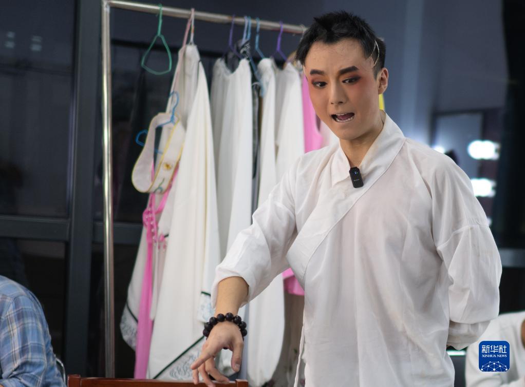 10月28日,黃梅戲演員李洋在化妝間開(kāi)嗓練聲。