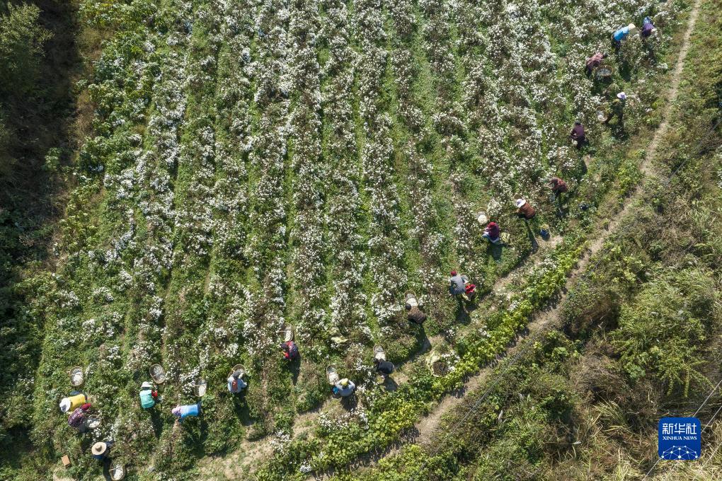 11月7日,在安徽省蕪湖市繁昌區峨山鎮東島村,村民在采摘貢菊(無(wú)人機照片)。