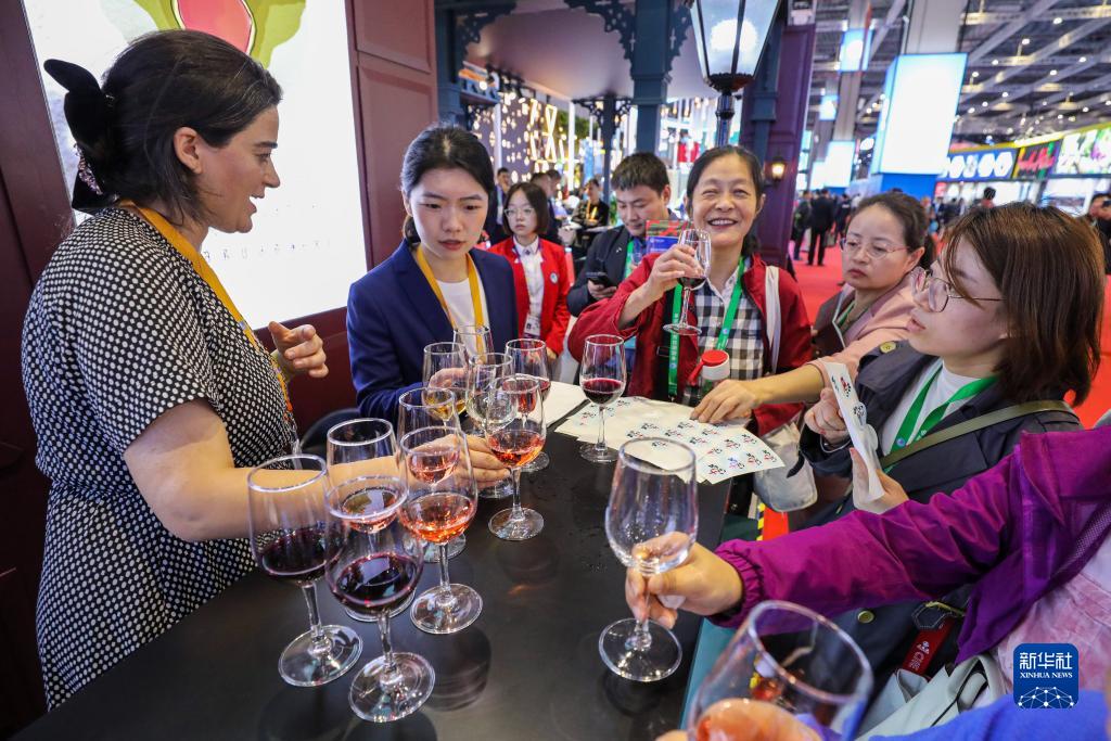 11月6日,參觀(guān)者在第六屆進(jìn)博會(huì )國家展格魯吉亞展臺品嘗格魯吉亞紅酒。