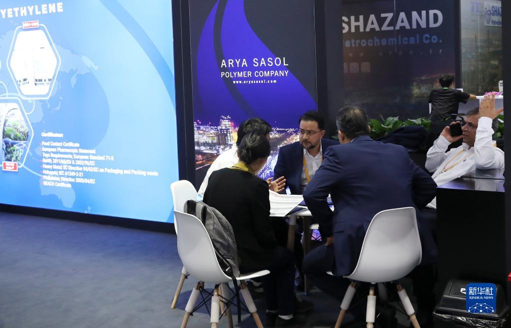 11月7日,參觀(guān)者在第六屆進(jìn)博會(huì )技術(shù)裝備展區的伊朗石油化學(xué)和工業(yè)公司展臺與展方工作人員交流。