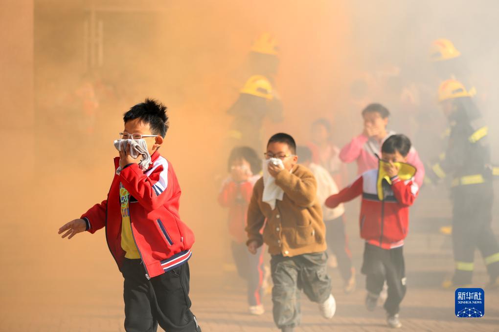 11月7日,山東省郯城縣消防救援大隊的消防救援人員在東方紅小學(xué)指導學(xué)生開(kāi)展火場(chǎng)逃生疏散演練。