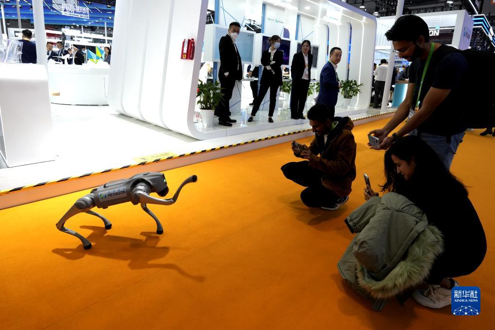 11月7日,在第六屆進(jìn)博會(huì )技術(shù)裝備展區,觀(guān)眾與??怂箍嫡故镜闹悄軝C器狗互動(dòng)。