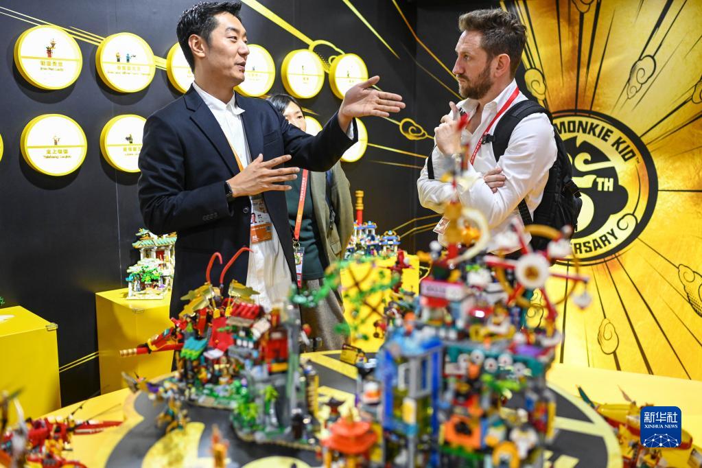 11月6日,在第六屆進(jìn)博會(huì )消費品展區樂(lè )高集團展臺,參展商介紹樂(lè )高玩具。