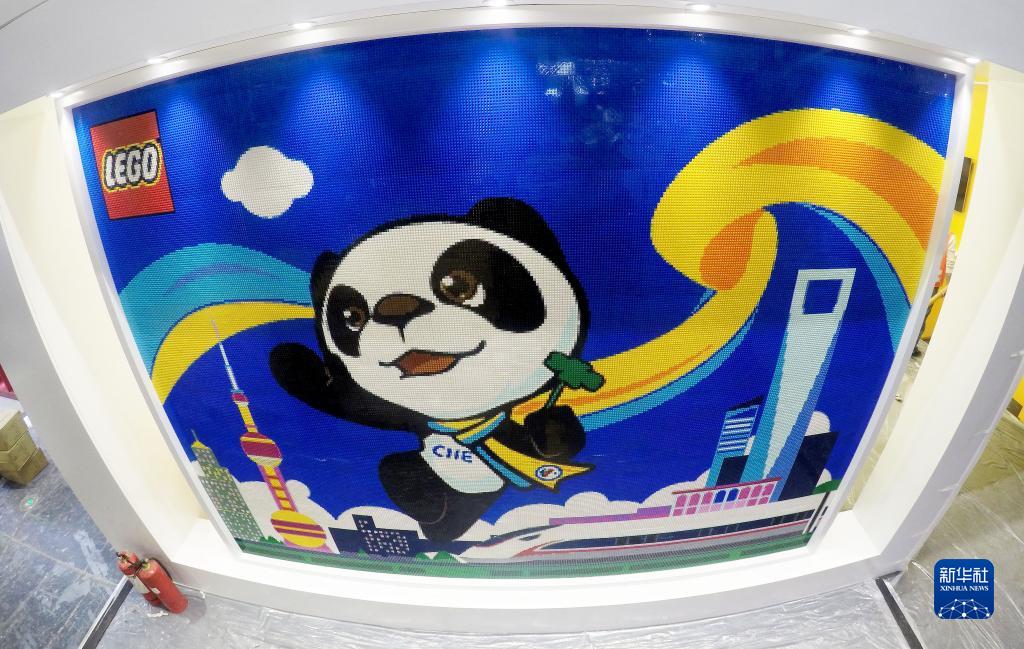 這是2018年10月31日在國家會(huì )展中心(上海)拍攝的一面以首屆中國國際進(jìn)口博覽會(huì )吉祥物“進(jìn)寶”為主題的樂(lè )高積木墻。