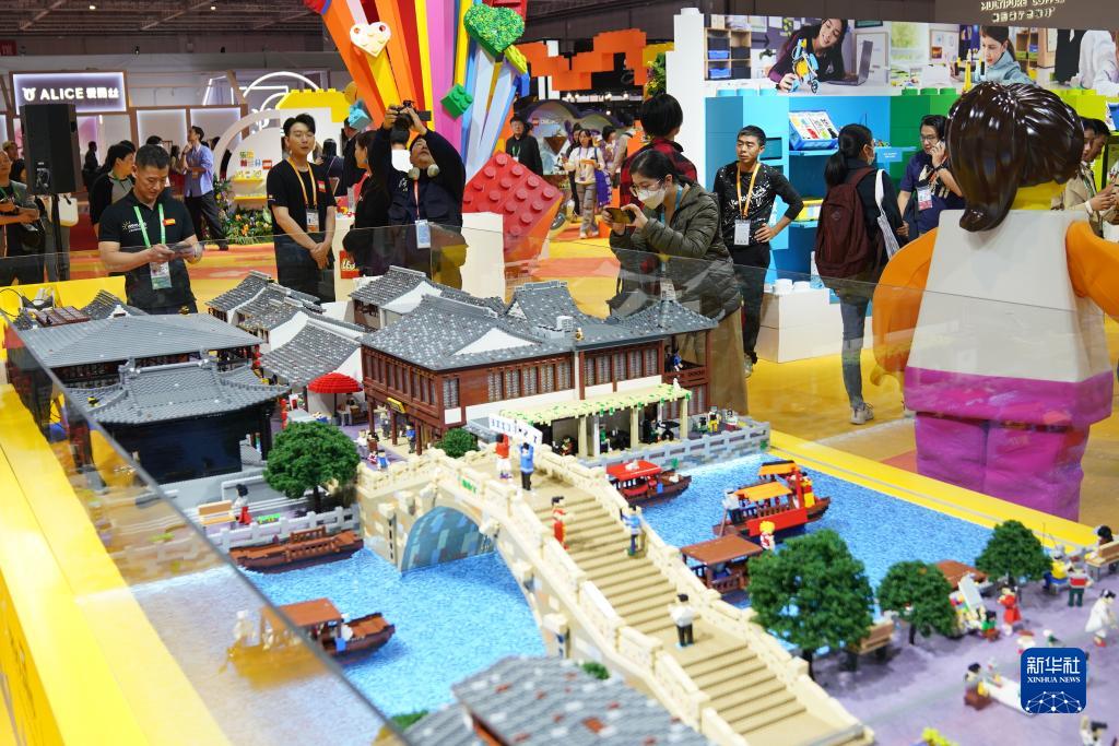 11月7日在第六屆進(jìn)博會(huì )消費品展區樂(lè )高集團展臺拍攝的楓涇古鎮樂(lè )高模型。