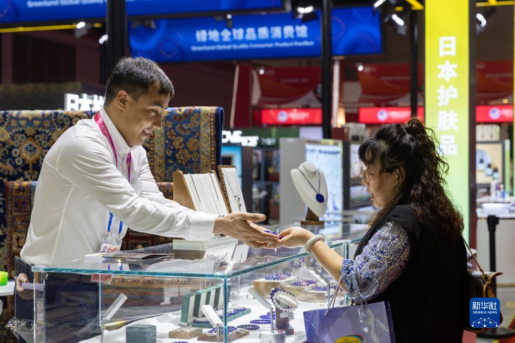 11月5日,阿里(左)在第六屆進(jìn)博會(huì )消費品展區向參觀(guān)者介紹阿富汗青金石飾品。