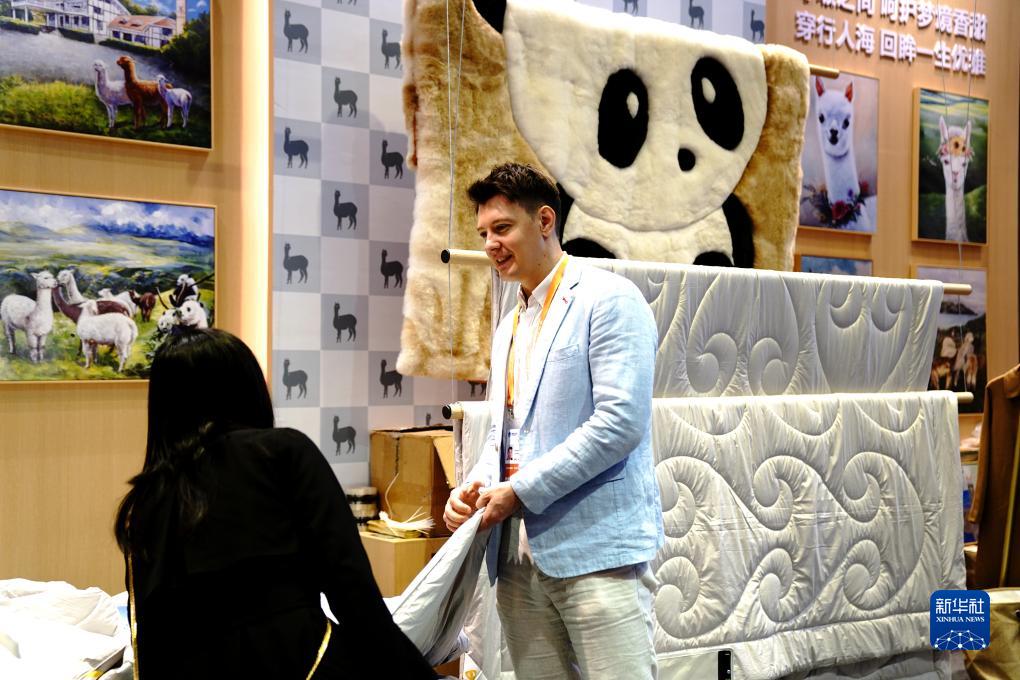 11月8日,在第六屆進(jìn)博會(huì )消費品展區,太平洋羊駝家紡聯(lián)合創(chuàng )始人迪馬(右)向觀(guān)眾介紹羊駝被。