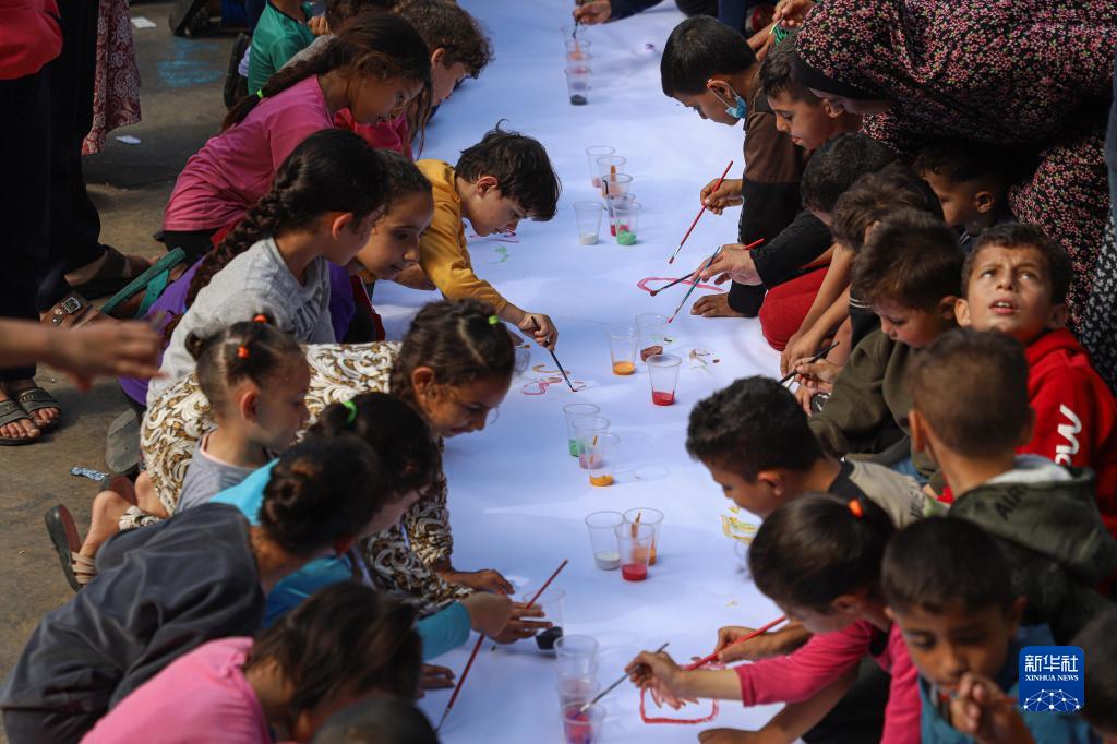 當日,在加沙地帶南部城市汗尤尼斯的一所聯(lián)合國近東巴勒斯坦難民救濟和工程處附屬學(xué)校內,當地志愿者組織多種活動(dòng),關(guān)愛(ài)流離失所的兒童,撫慰戰事創(chuàng )傷。新一輪巴以沖突爆發(fā)一個(gè)月來(lái),加沙地帶已有超過(guò)1萬(wàn)人死亡,其中大約40%是兒童。