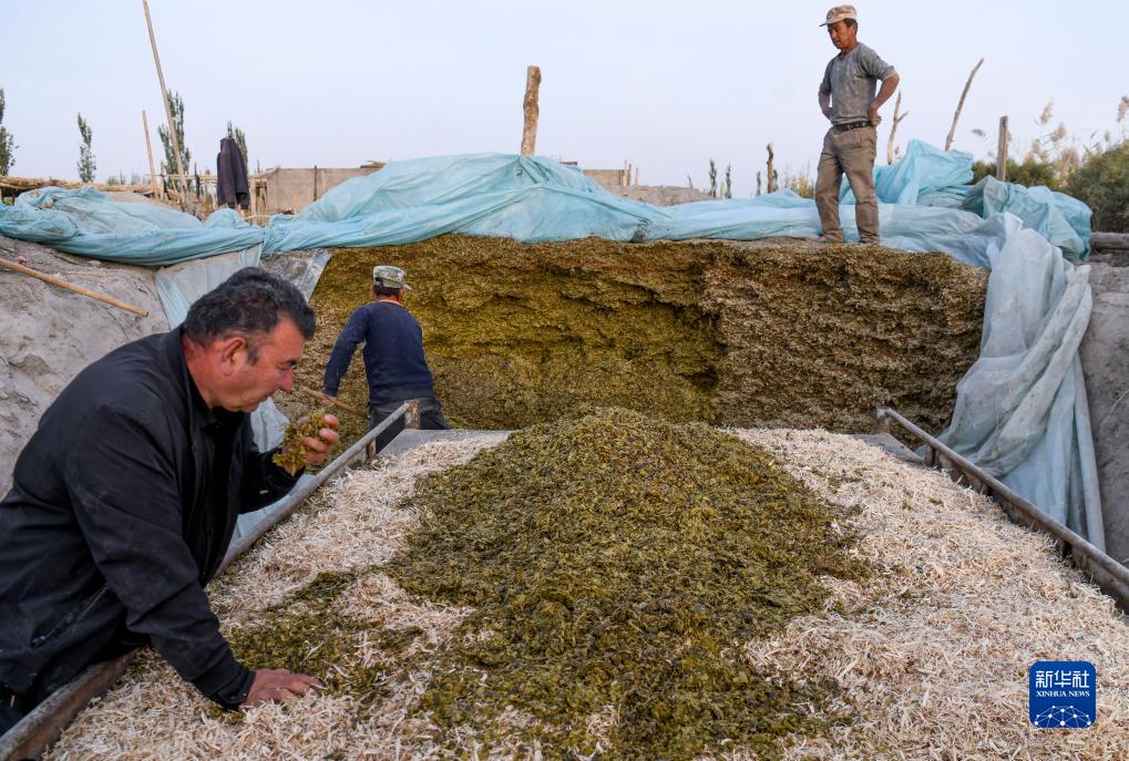 在新疆尉犁縣巴西買(mǎi)里村,爾肯檢查草料是否霉變(10月19日攝)。