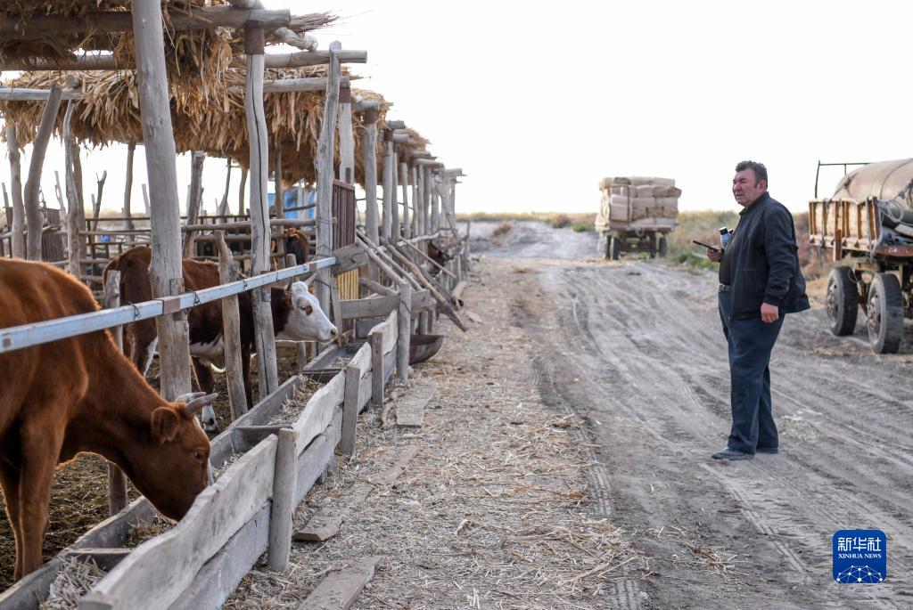 在新疆尉犁縣巴西買(mǎi)里村,爾肯查看自家養的牛(10月19日攝)。