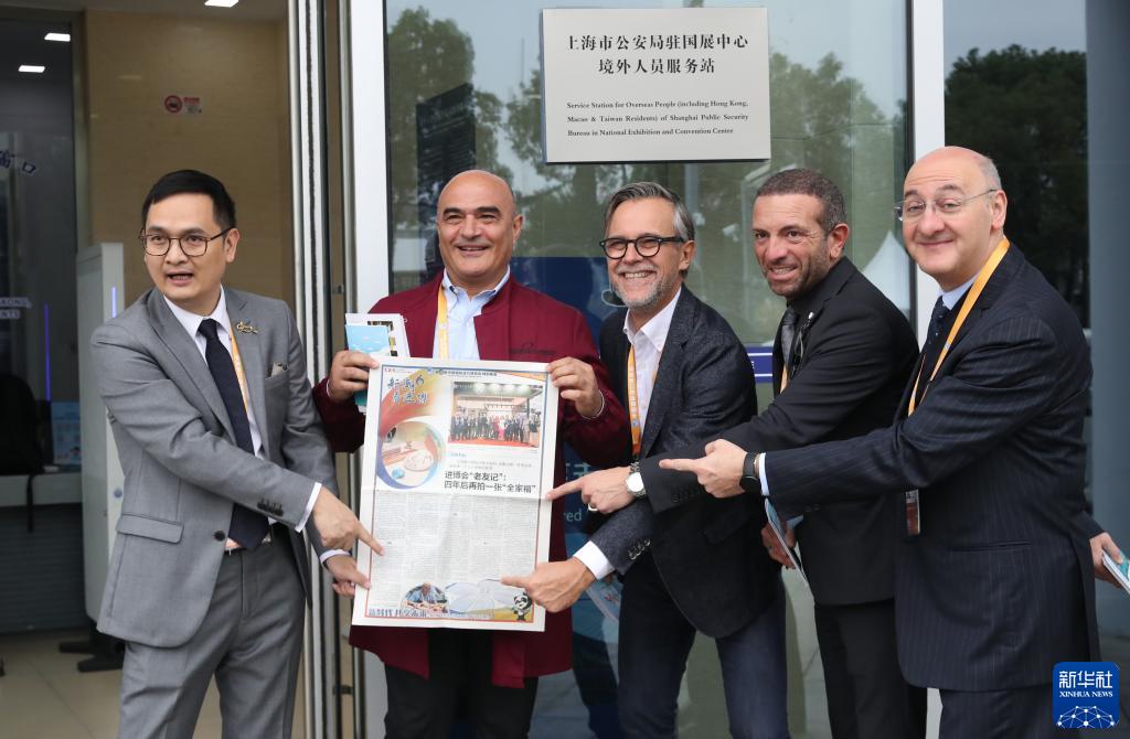 11月9日,在上海市公安局駐國展中心境外人員服務(wù)站,組團辦理簽證的意大利參展商手持有他們報道的本地報紙合影。