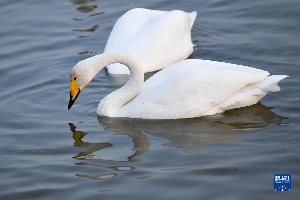 11月8日,大天鵝在三門(mén)峽市天鵝湖國家城市濕地公園內棲息。