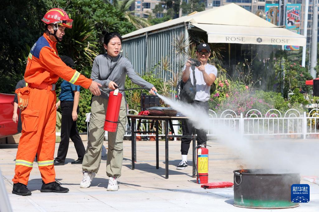 11月9日,在福建省廈門(mén)市湖里區,市民在消防員的指導下體驗使用滅火器。