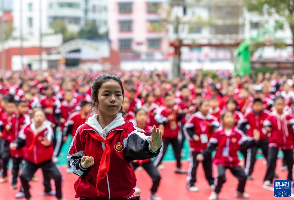 11月9日,在黃平縣新州鎮第二小學(xué),學(xué)生在大課間做活動(dòng)。