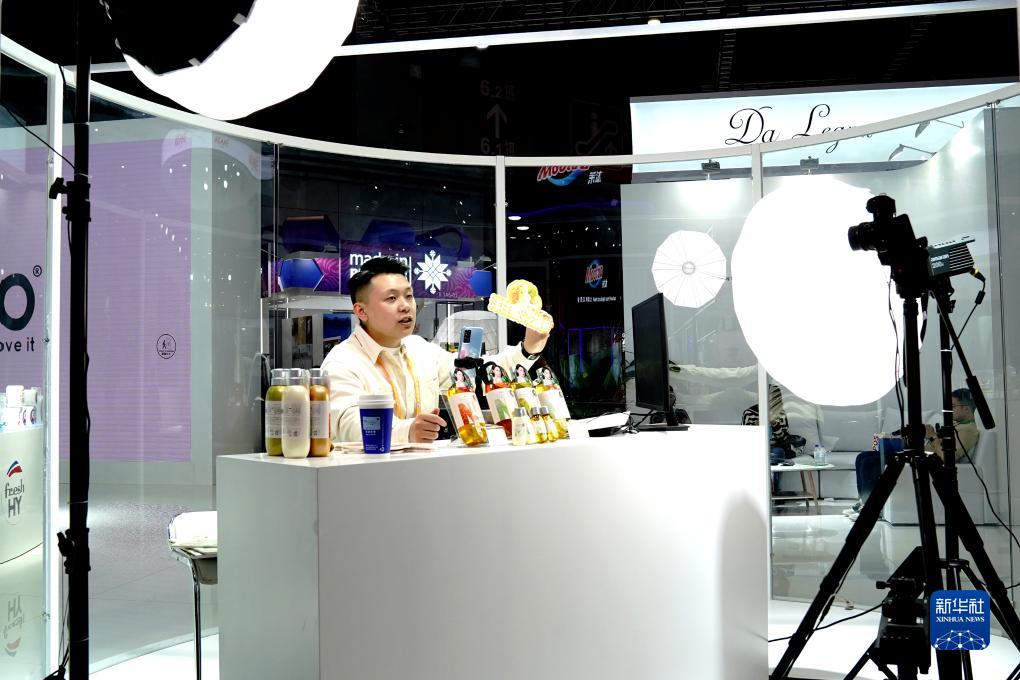 這是11月8日在第六屆進(jìn)博會(huì )消費品展區拍攝的直播銷(xiāo)售場(chǎng)景。