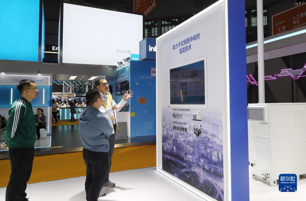 11月9日,一名工作人員(右)在東芝公司展臺向參觀(guān)者介紹公司的氫能技術(shù)應用信息。