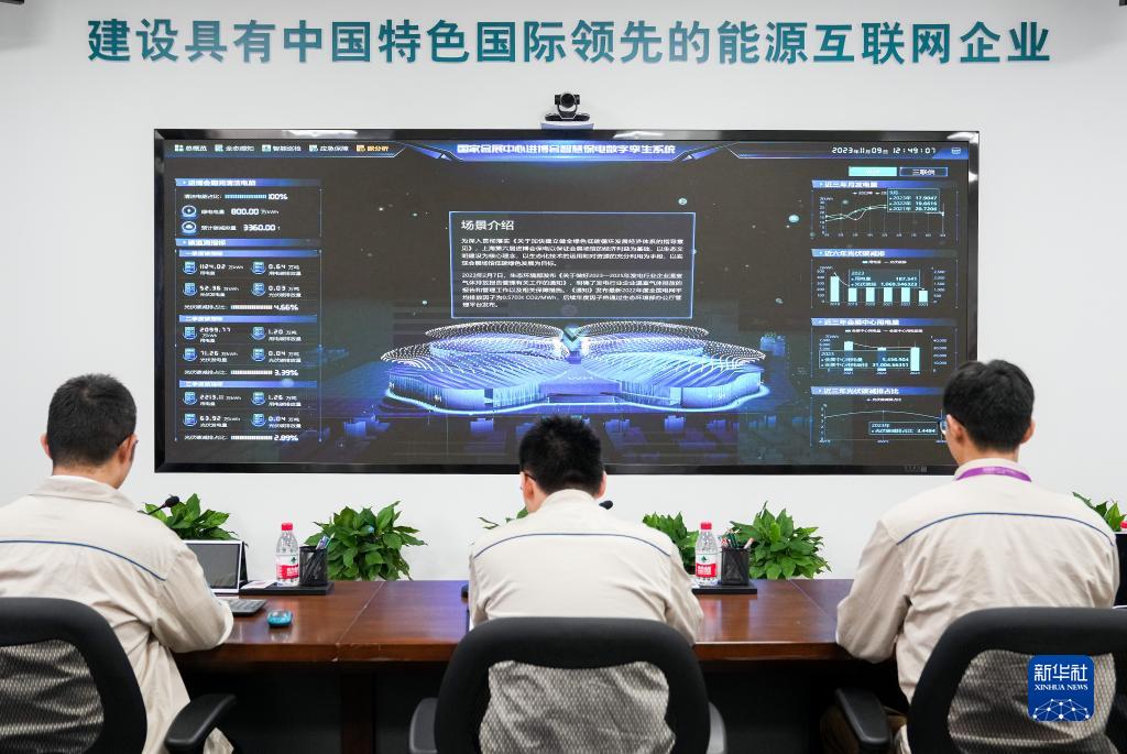 11月9日,國網(wǎng)上海青浦供電公司的工作人員在中國國際進(jìn)口博覽會(huì )供電服務(wù)現場(chǎng)指揮中心內工作。第六屆進(jìn)博會(huì )首次實(shí)現全綠電辦展。