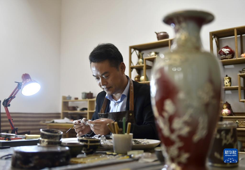 河南省郟縣金鑲玉制作技藝是國家級非物質(zhì)文化遺產(chǎn)代表性項目,歷史悠久,獨具文化內涵和藝術(shù)價(jià)值。據介紹,金鑲玉制作技藝原為對有瑕疵或破損的玉石、茶具等器物,用銅、錫等金屬絲片進(jìn)行掩飾、修補的鑲嵌工藝,后來(lái)逐步發(fā)展成為在陶瓷、紫砂等器物表面鑲嵌不同金屬(或合金)圖紋裝飾的獨特工藝。