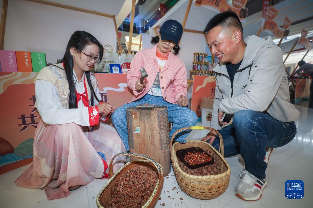 11月10日,在杭州市親橙里購物中心的“清涼峰味”共富品牌推介會(huì )上,清涼峰鎮的工作人員現場(chǎng)砸山核桃讓顧客品嘗。