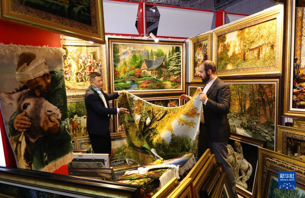 11月10日,在第六屆進(jìn)博會(huì )上,一名參觀(guān)者在一家伊朗手工掛毯展位上查看一款風(fēng)景畫(huà)掛毯。