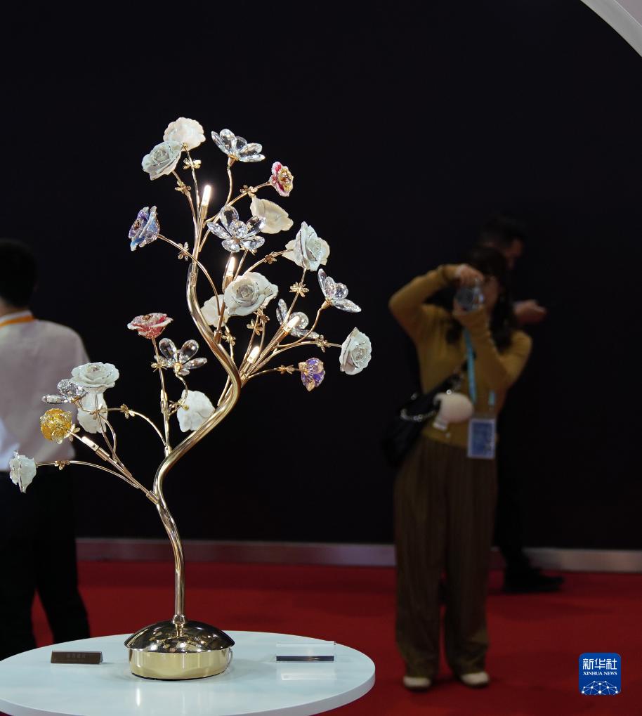 11月9日,在第六屆進(jìn)博會(huì )消費品展區,參觀(guān)者在EJI(雅寶珠寶國際有限公司)展臺拍攝展出的琺瑯鉆石花燈。